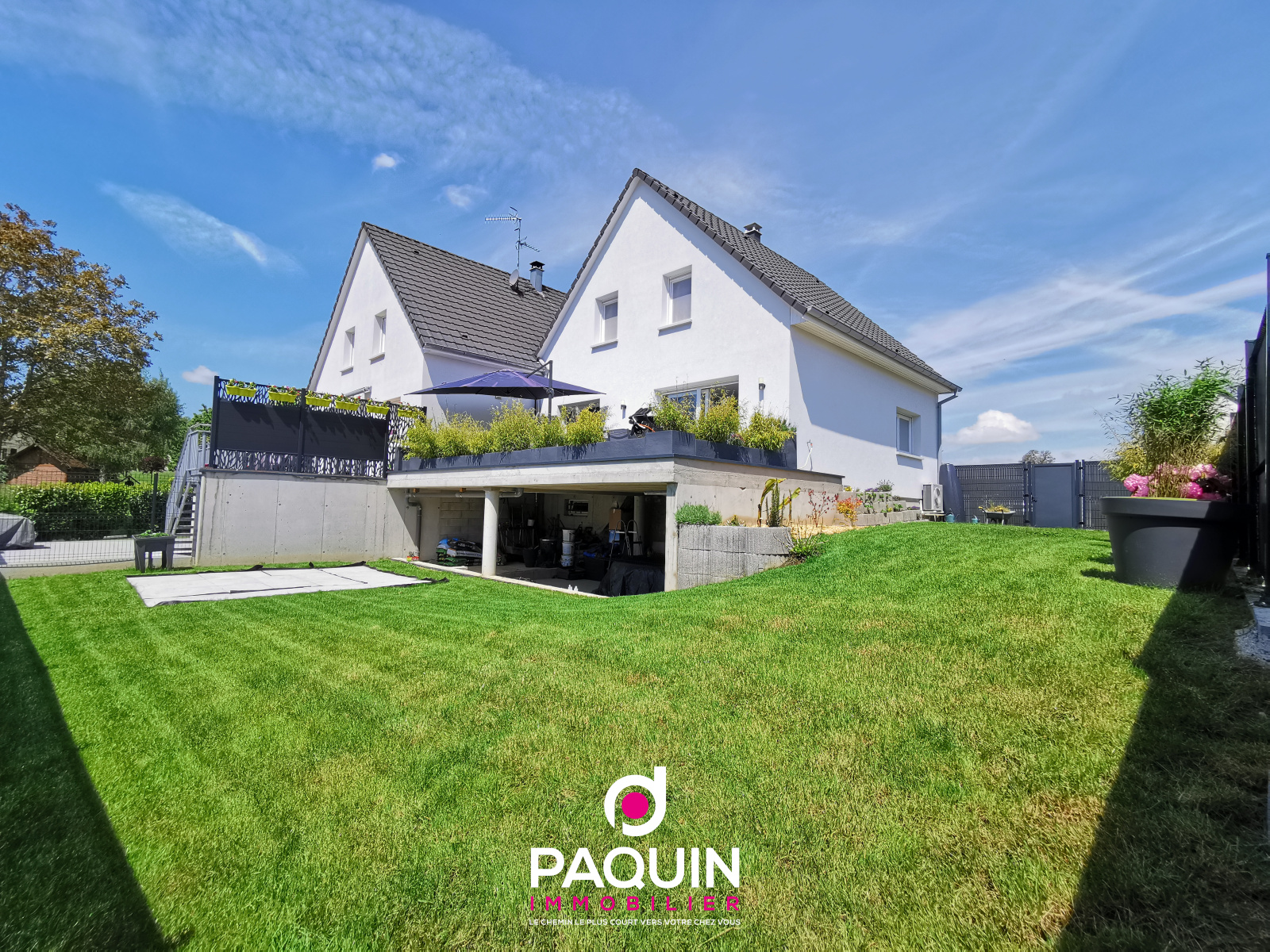 Concernant l'exterieur vous profiterez d'une grande terrasse sur pilotis de 40m² exposée sud. Le jardin est entièrement clôturé. A l'avant de la maison deux places de parking.